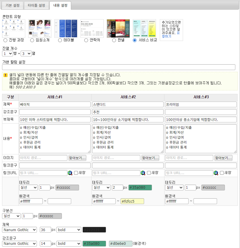 홈페이지빌더 - 잡동사니/페이지꾸미기 모듈에 서비스 비교기능 콘텐트가 추가되었습니다. 오즈웹2026.02.24 14:48:28 조회644 오즈홈빌더에서 잡동사니/페이지꾸미기 모듈 및 웹에디터 위젯중 "콘텐트박스" 위젯에서 아래와 같이 서비스 또는 제품사양을 비교하는 콘텐트를 쉽게 구성할 수 있는 기능이 추가되었습니다.